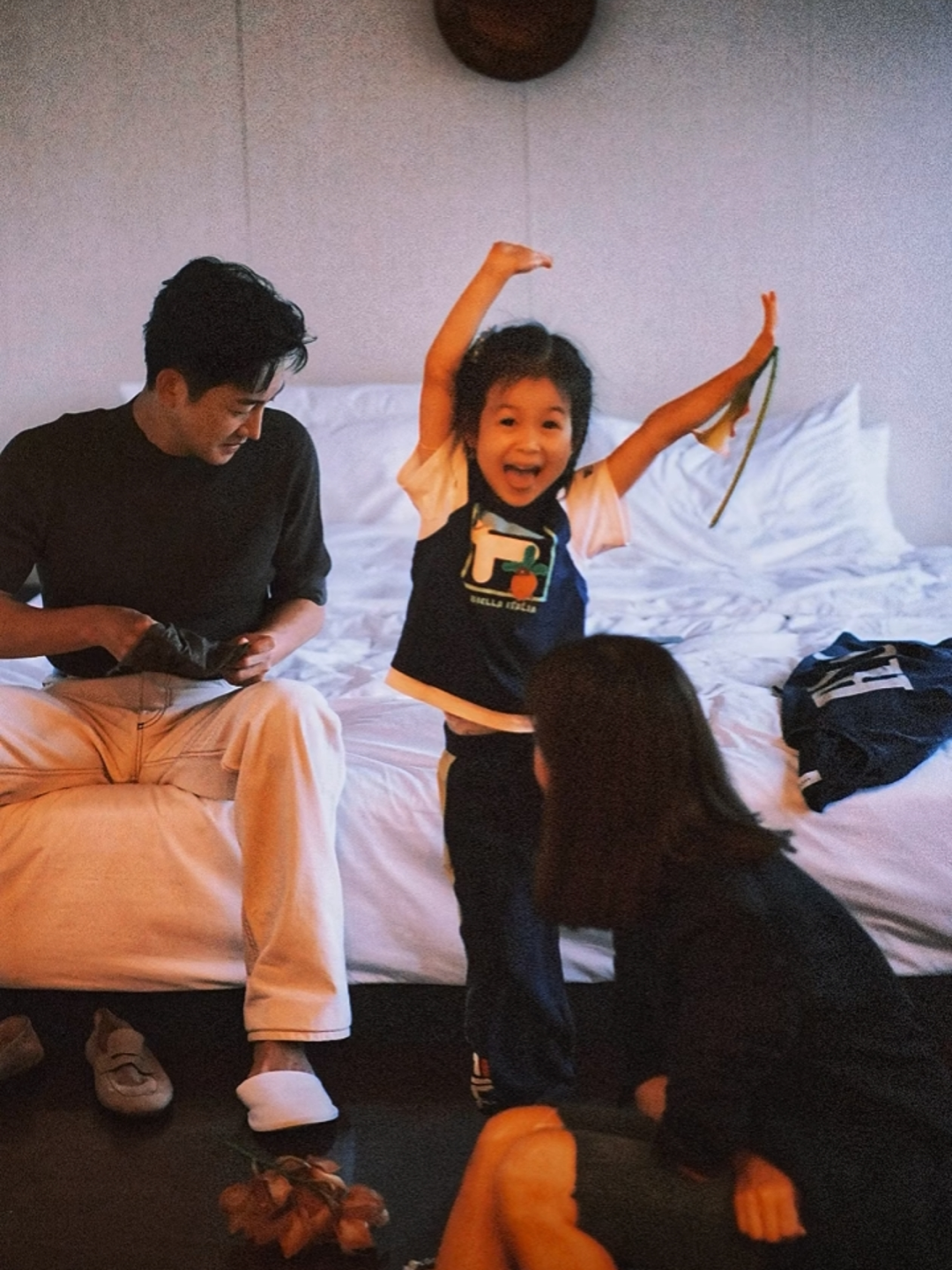 即使在酒店这样陌生的环境,Molly也因为见到爸爸而雀跃,对镜头摆姿势大笑,落落大方非常讨喜,一身符合年龄的童稚感。